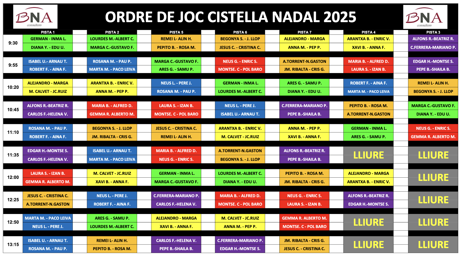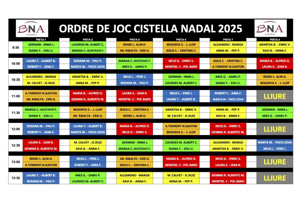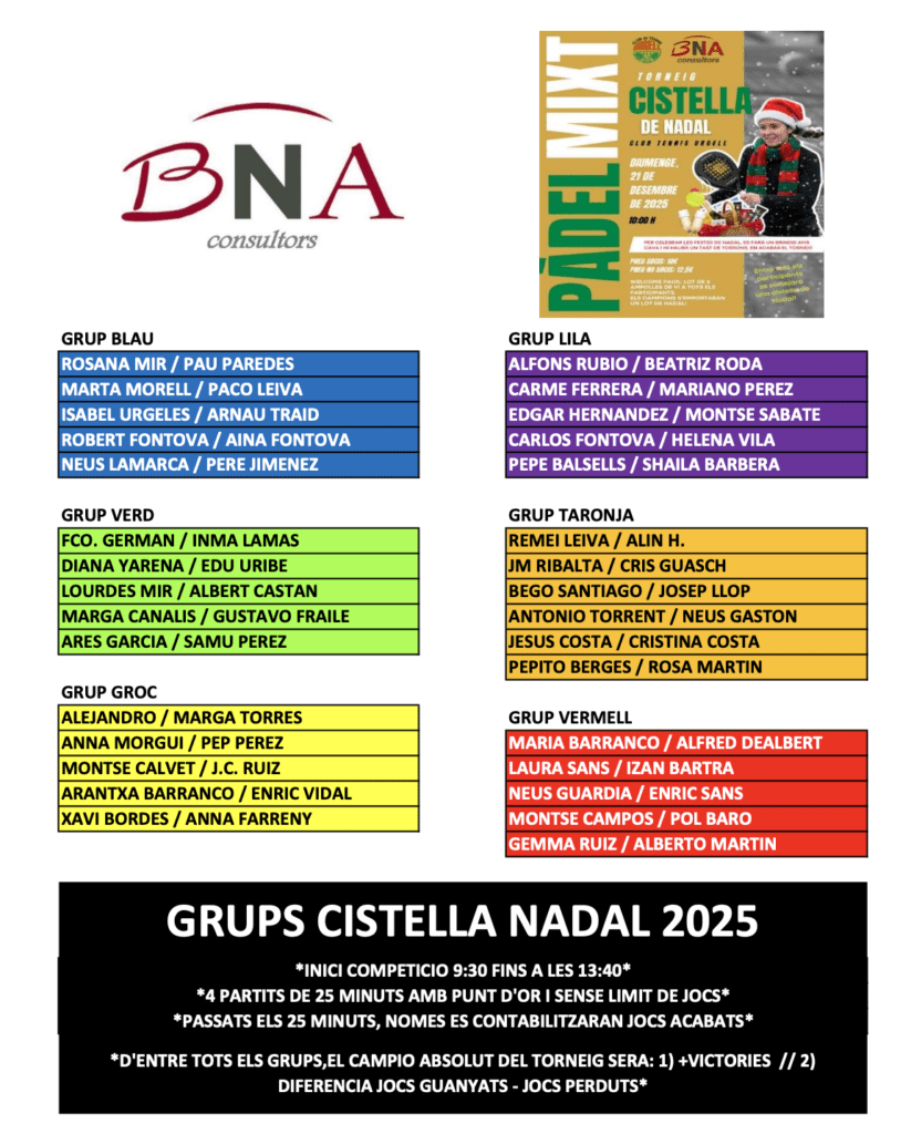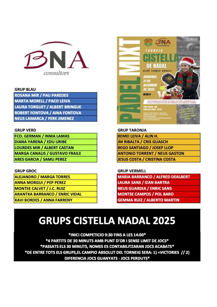 Ja tenim els grups i l’ordre per una nova edició del Torneig de Pàdel Mixt Cistella de Nadal, que celebrarem a les nostres instal·lacions el proper 21 de desembre.