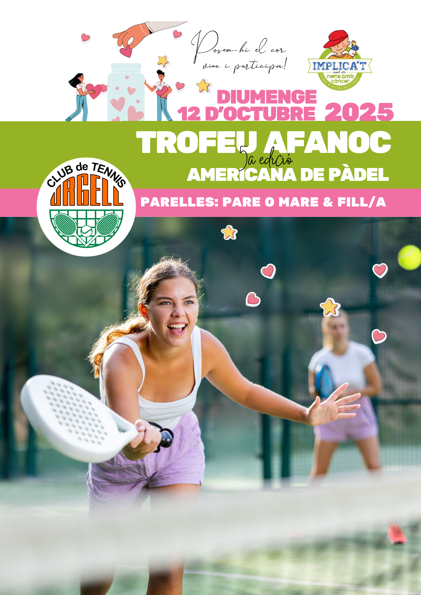 El diumenge 12 d’octubre és la data escollida per a la celebració, al Tennis Urgell, de la cinquena edició del Trofeu AFANOC-Americana de Pàdel, una jornada benèfica que destinarà tots els fons que es recullin a l’AFANOC (Associació de Familiars i Amics de Nens Oncològics de Catalunya).